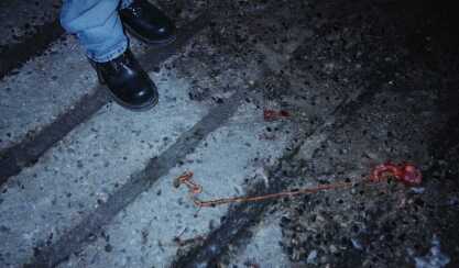 These are the entrails of one of the birds. Although it's hard to tell from this picture, notice that while the guts have been torn from the bird's body, the stomach is still entirely intact. |