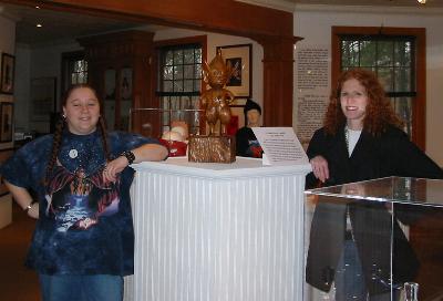 | Heather and Bel surround a small wood figure of the Jersey Devil, based on the sketch by Ed Sheetz. |