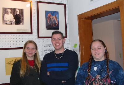 | Heather, Bel, and Mike pose in front of a giant poster of the article describing the kangaroo hoax by Norman Jefferies. |  |
