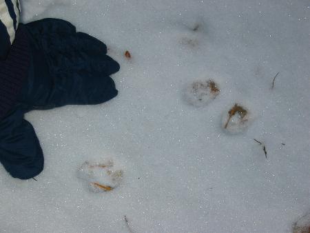 This is an example of the tracks we found by the cars. Note how there is one large print in the bottom left (which could be 2 small ones together), and two larger prints in the top right. |